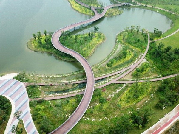 合理布置凌空栈道,串联各区域节点及人工岛,穿梭于林间及天然湖面之上,近距离感受自然景观。